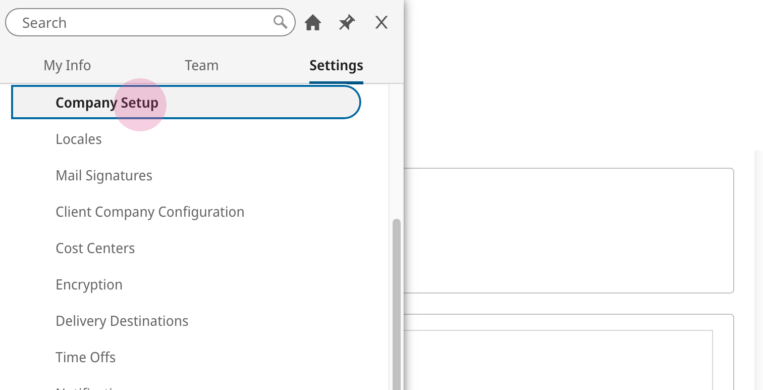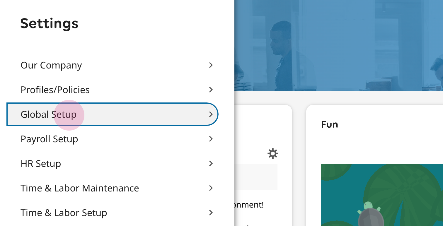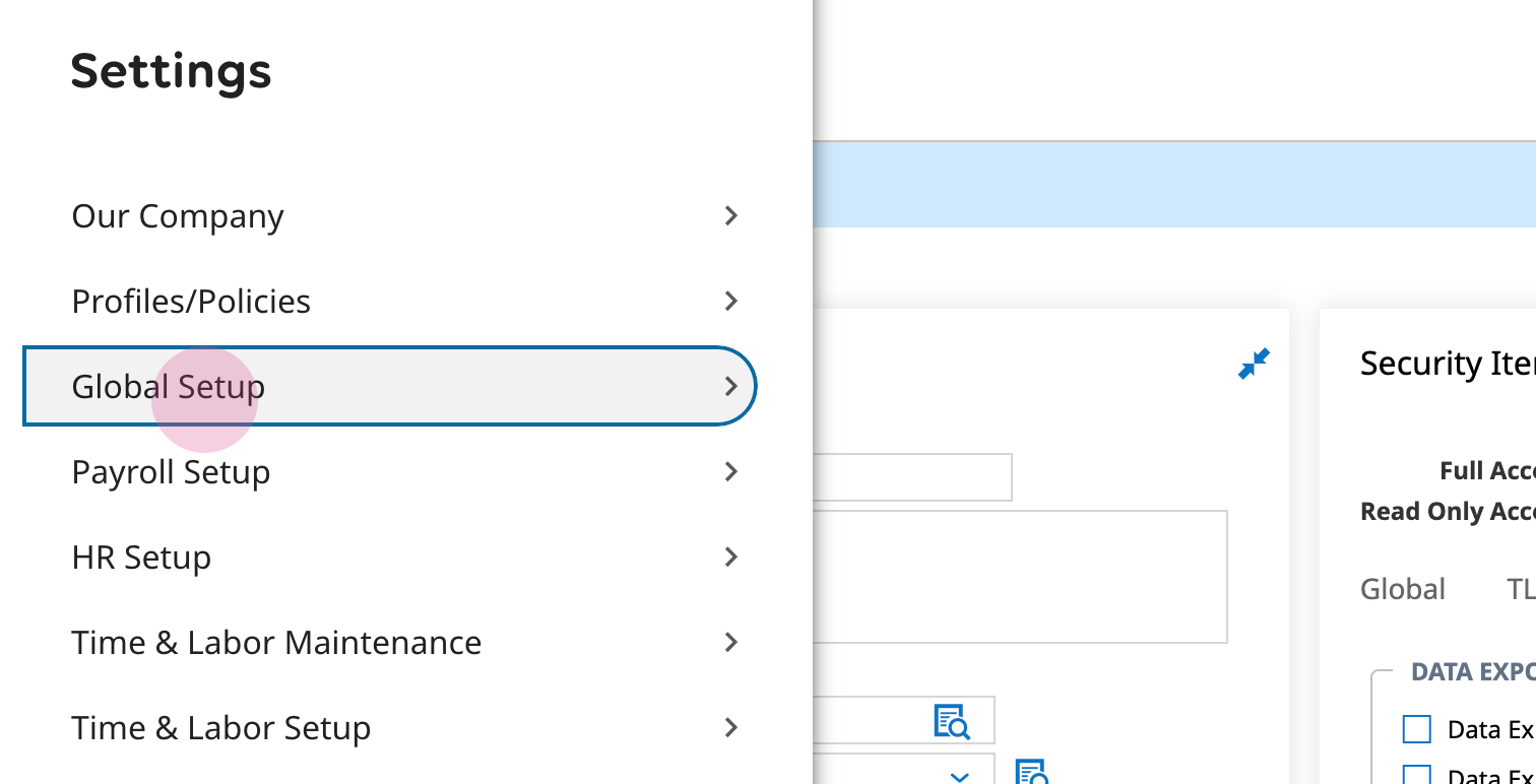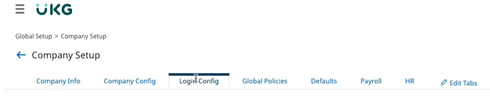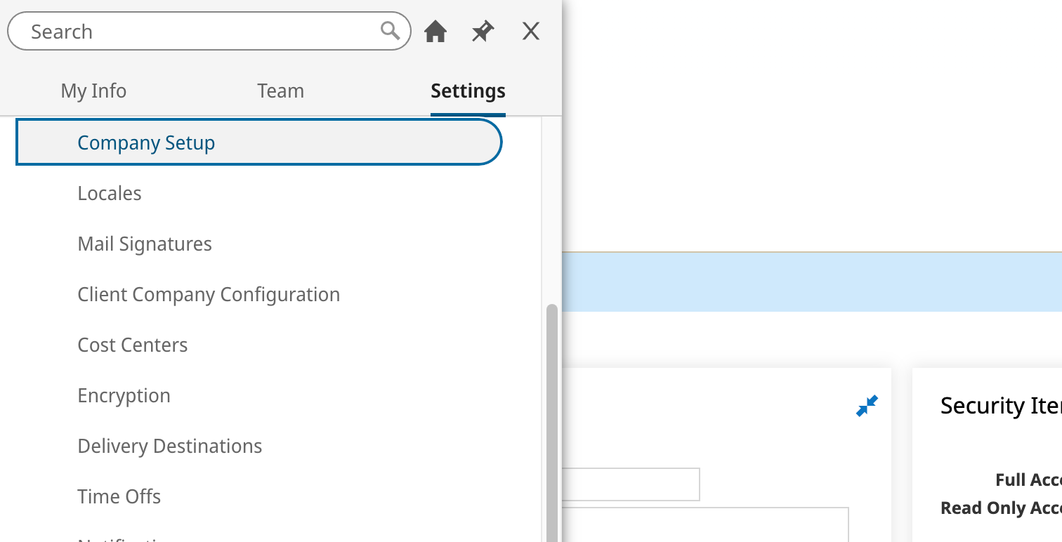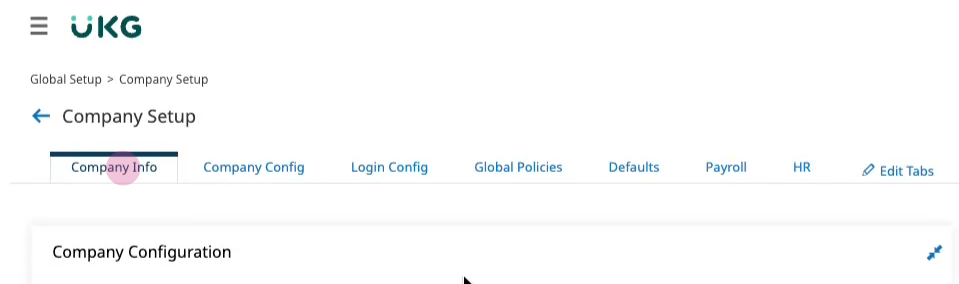 11. In your UKG Ready site, navigate to Settings > Global Setup > Company Setup from the top left menu. This will open the company settings.