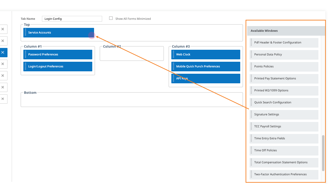 27. Under Available Windows, select Service Accounts and drag it to the Top section. Then click Save.
