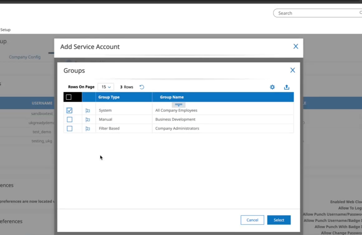 30. Under Account Access > Account Groups, click the magnifying glass and select All Company Employees, and click on Select.