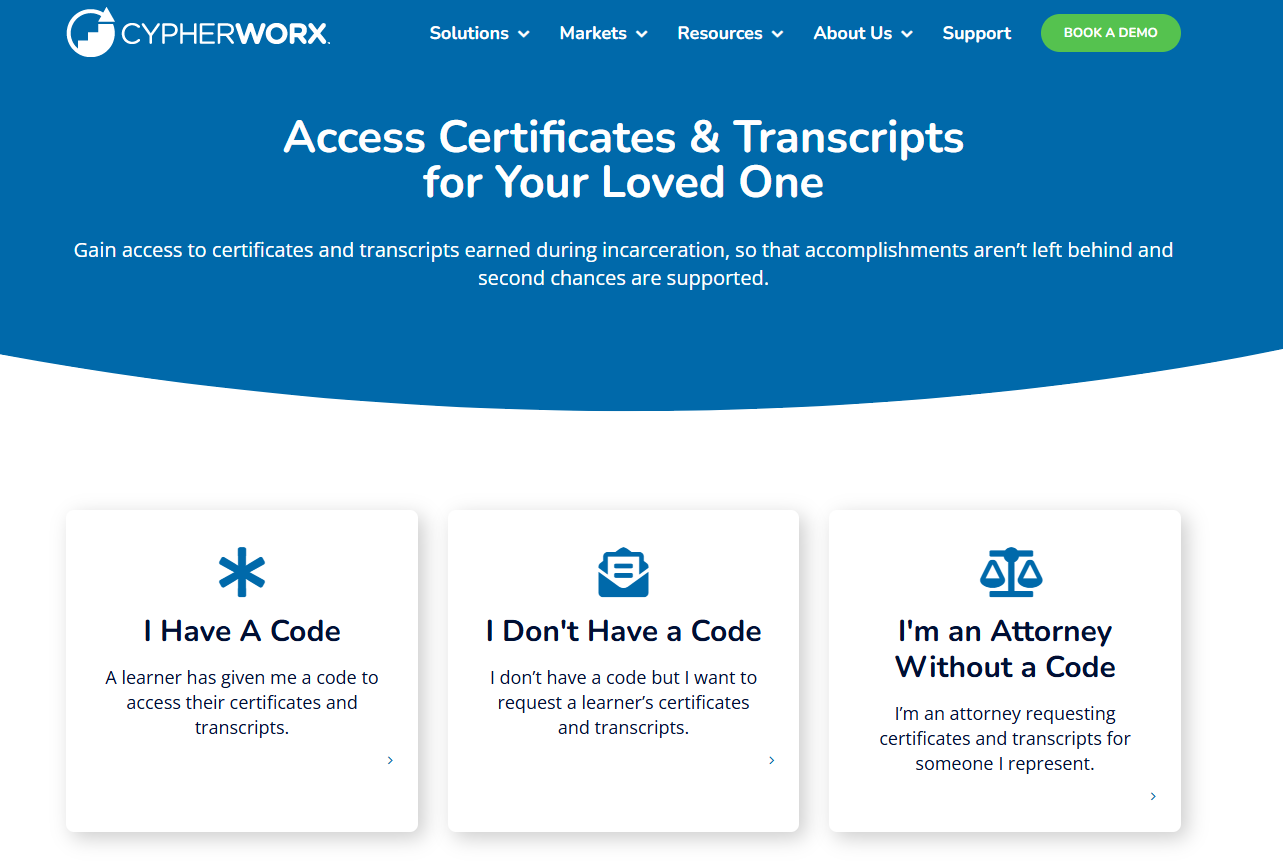 CypherWorx provides a secure way for incarcerated learners to share their earned certificates and transcripts with others. Follow the steps below based on your role.